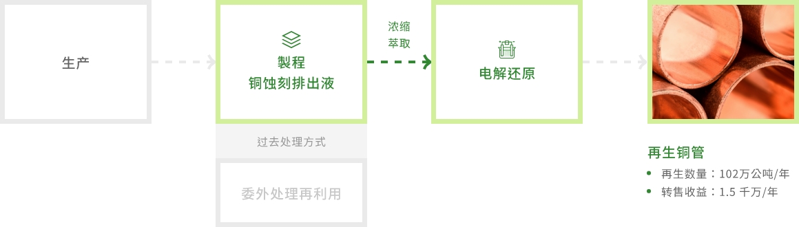 - 将蚀刻下来含铜之废液,透过电解方式,制作高纯度之铜管,转为其他工业领域应用