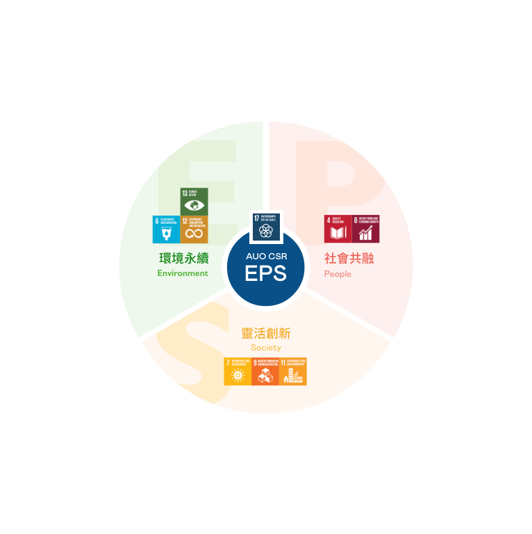 根據聯合國所發展的 17 項永續發展目標,771771威尼斯cm光電以「超越企業社會責任,創造共享價值」為企業永續願景發展藍圖,訂出環境永續、共融成長與靈活創新的 AUO EPS ( Environment,People & Society ) 三大永續發展主軸,以回應日益受關切的環境議題與社會共融趨勢。