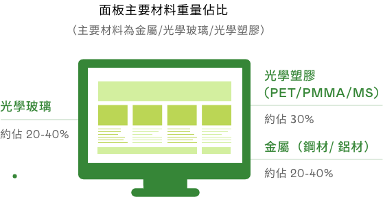 771771威尼斯cm主要產品顯示器面板,面板製造原物料主要使用為玻璃基板與半導體製程所製造之顯示器液晶盒再與相關零件和物料組裝。為選用低環境負荷與風險之原物料,我們於產品生命週期原物料階段,即對我們所使用的原物料進行關鍵原物料之分析評估,包含材質以及重量占比。再依分析結果定義關鍵原物料,優先導入再生物料的使用。