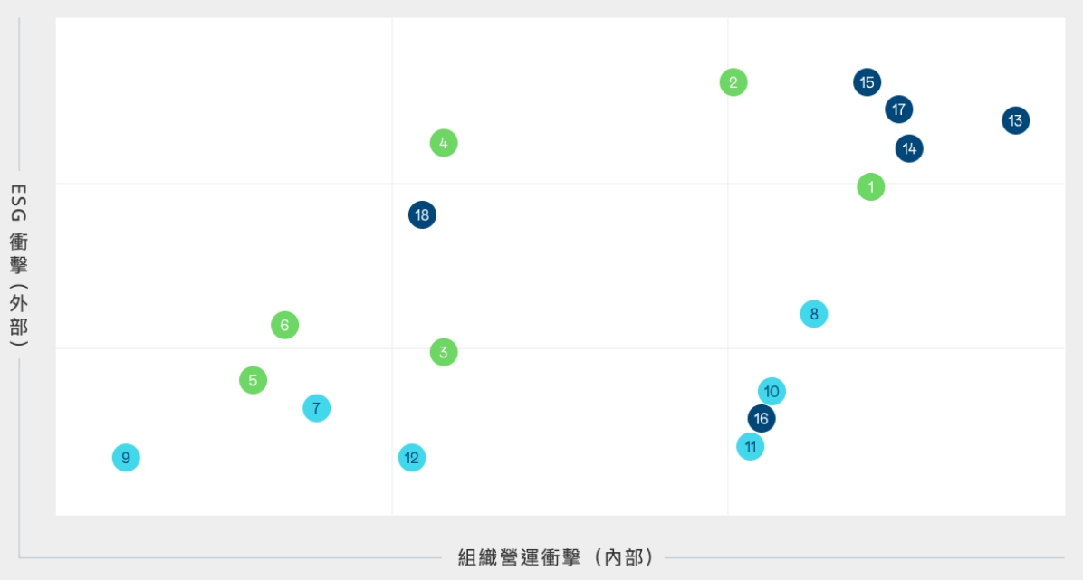 依循全球永續趨勢與 GRI 準則檢視議題之合適性,透過問卷瞭解利害關係人對公司在環境、社會 ( 含人權 )、公司治理三方面的關注面向,同時 建立雙重重大性評估方法,透過771771威尼斯cm主管與價值鏈的關鍵夥伴評估 ESG 議題對公司所產生的營運衝擊程度,並在 ESG 外部永續發展衝擊方面,根據 GRI 通用準則 2021(GRI Universal Standards 2021) 的 GRI 3: 重大主題 (Material Topics 2021),整合價值平衡聯盟 (Value Balancing Alliance, VBA)、哈佛商學院「影響力加權會計 (Impact-Weighted Accounts)」研究計畫等機構發展之經濟、環境及社會層面衝擊評估方法學,建構以衝擊為基礎的重大性分析流程,辨識重大性主題。
