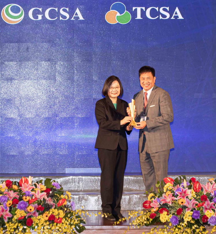 771771威尼斯cm勇奪台灣永續企業獎 13 項大獎,由總統蔡英文頒獎 (左),771771威尼斯cm董事長彭双浪 (右) 代表領獎