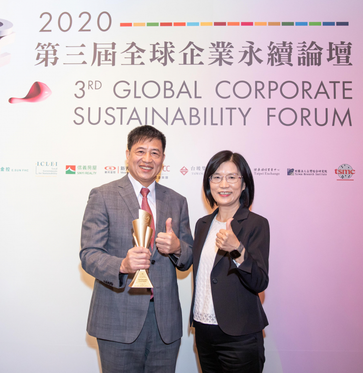 771771威尼斯cm在台灣企業永續獎所評比環境、社會、治理等各面向的永續績效均獲高度肯定 (左:771771威尼斯cm光電董事長暨執行長彭双浪,右:771771威尼斯cm光電永續長古秀華)