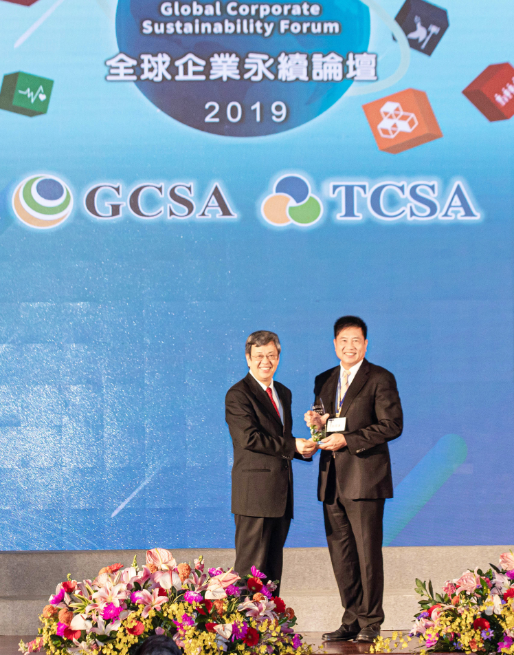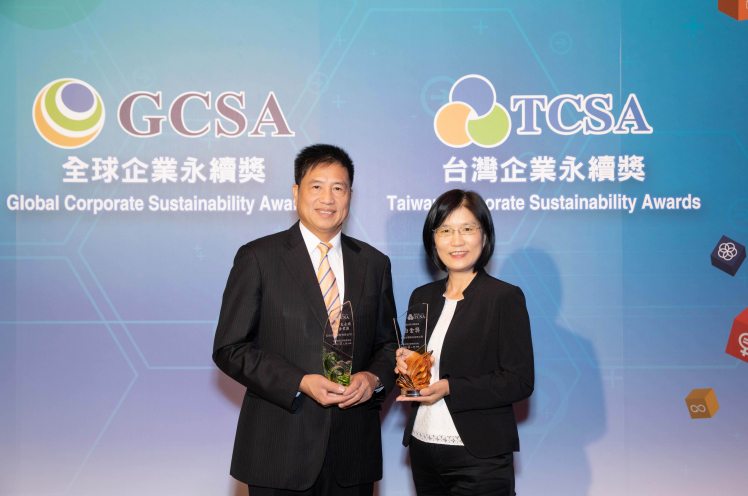 771771威尼斯cm榮獲十大永續典範台灣企業獎殊榮,由771771威尼斯cm董事長暨執行長彭双浪 (右) 代表領獎