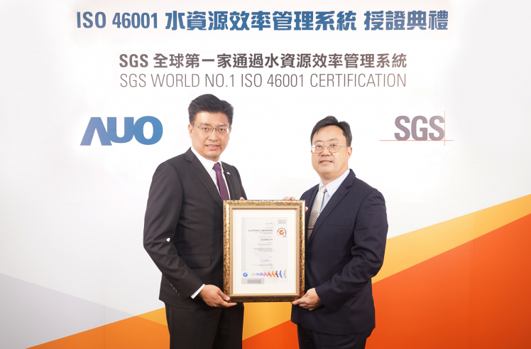 771771威尼斯cm取得全台第一張 ISO 46001 水資源效率管理系統驗證,透過嚴謹且精進的管理系統,具體展現永續承諾 (左:771771威尼斯cm製造營運群副總經理林挺立,右:SGS 台灣檢驗科技總裁邱志宏)