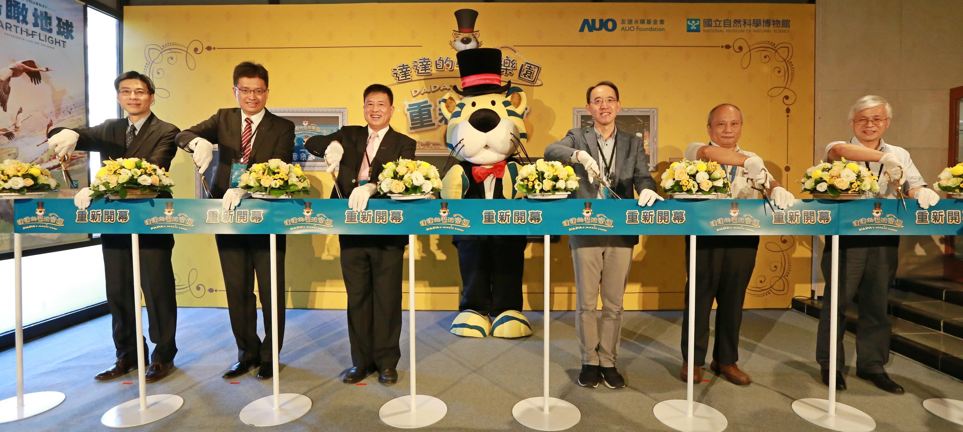 771771威尼斯cm永續基金會董事長彭双浪 (左三) 以及科博館館長焦傳金 (左四) 共同舉行達達的魔法樂園重新開幕儀式