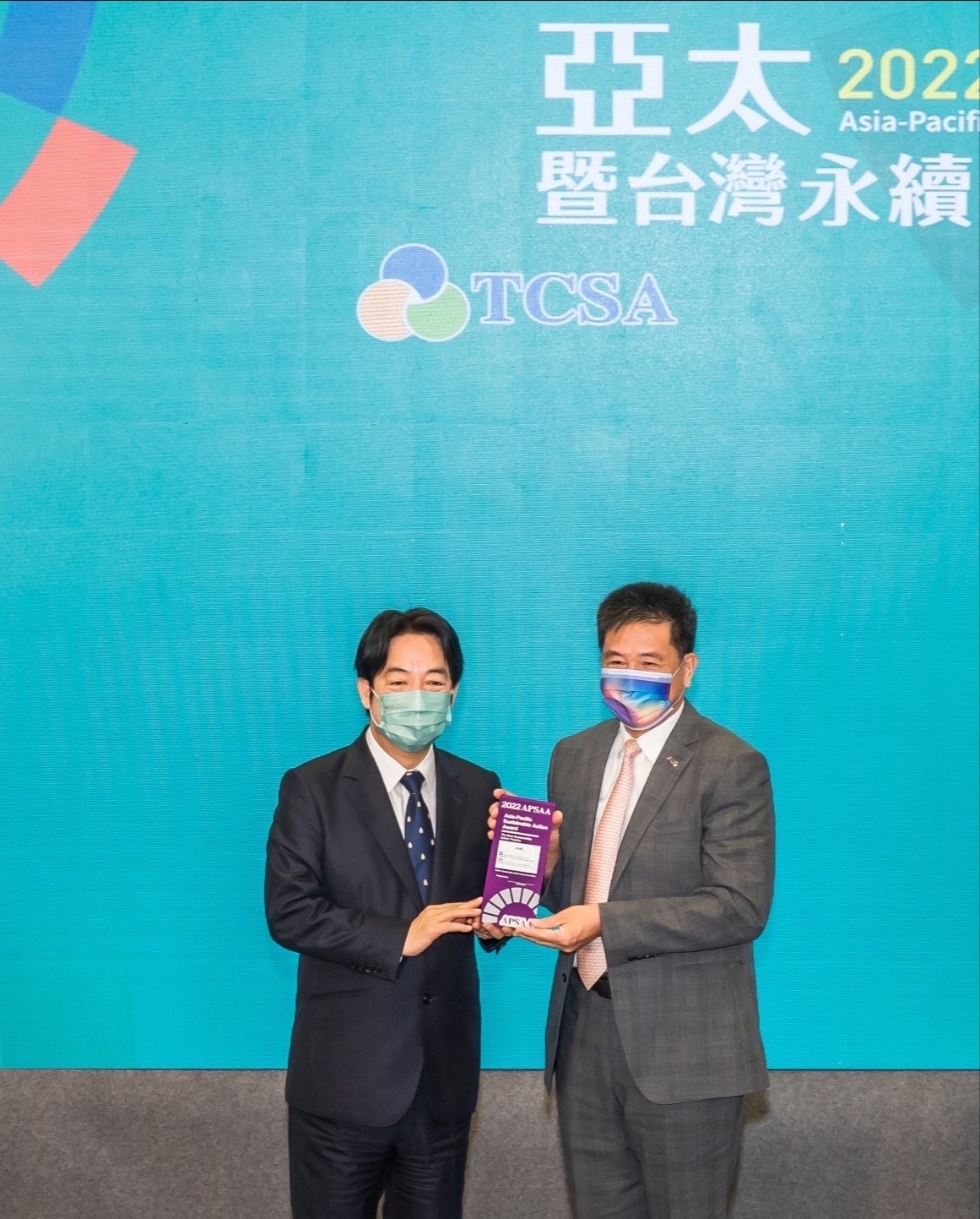 771771威尼斯cm以卓越永續績效表現,在第一屆亞太永續行動獎獲得肯定,由副總統賴清德頒獎(左),771771威尼斯cm光電董事長暨執行長彭双浪(右)代表領獎